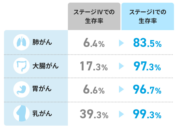 早期がんの段階で治療を始めれば、5年後の生存率は大幅に上昇します。
